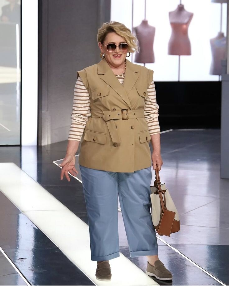 Дамы с пышными формами этой весной будут выглядеть стильно и эффектно, а самое главное – гармонично и привлекательно, ведь их проблемные зоны будут замаскированы, а достоинства представлены в самом лучшем виде. А отвечать за это будет грамотно подобранная одежда, обеспечивающая визуальный стройнящий эффект и несомненную элегантность. 1. Легкий, современный и заметно стройнящий весенний ансамбль для дамы с пышными формами – это прямые светло-голубые джинсы, подвернутые на щиколотках, бежевый лонгслив в светло-коричневую горизонтальную полоску и кофейно-бежевый жилет, по фасону напоминающий классическое пальто без рукавов. Благодаря крою джинсов и тому, что жилет в талии затягивается широким поясом, фигура полной дамы визуально кажется гармоничной и уравновешенной. 2. Стильно, женственно и очень элегантно может выглядеть дама-«пышка» в образе, составленном из кремовых прямых брюк классического кроя со стрелками, черной базовой футболки и оригинального удлиненного бежевого жакета в мелкий