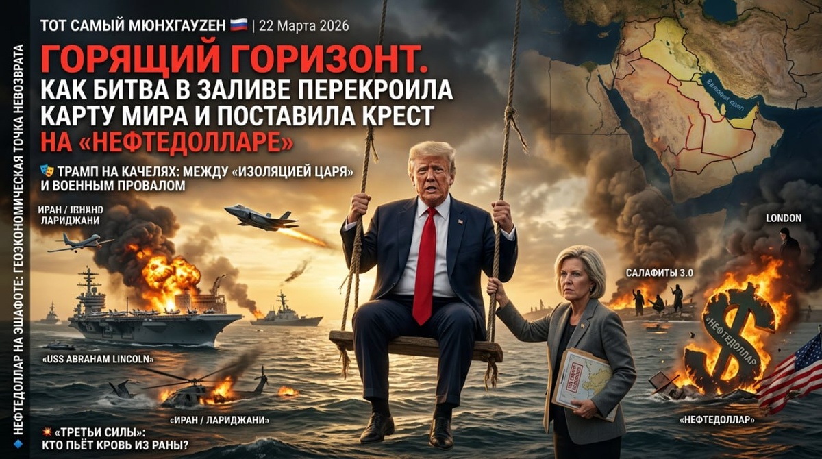 🚨 Колонка МюнхгауZена: Горящий Горизонт. Как война в Заливе перекроила карту мира и поставила крест на «нефтедолларе» 🎭 Трамп на качелях: между «изоляцией царя» и военным провалом На этом фоне особенно трагикомично выглядит фигура американского президента. Его риторика мечется между бравадой и растерянностью. С одной стороны — ультиматумы с угрозой ударить по иранским электростанциям, если Ормузский пролив не откроют в течение 48 часов. С другой — странные, почти капитулянтские заявления о том, что война «практически завершена», что цели «почти достигнуты» , в то время как на Ближний Восток перебрасываются всё новые эскадры морской пехоты, готовые к высадке на иранский остров Харг. Этот разрыв между словом и делом — не просто следствие непрофессионализма. Это — свидетельство глубокого политического кризиса внутри самой американской элиты. Сценарий, который мы наблюдаем, всё больше напоминает попытку «изоляции царя», когда узкая группа лиц во главе с Сюзан Уайлс пытается ограничить