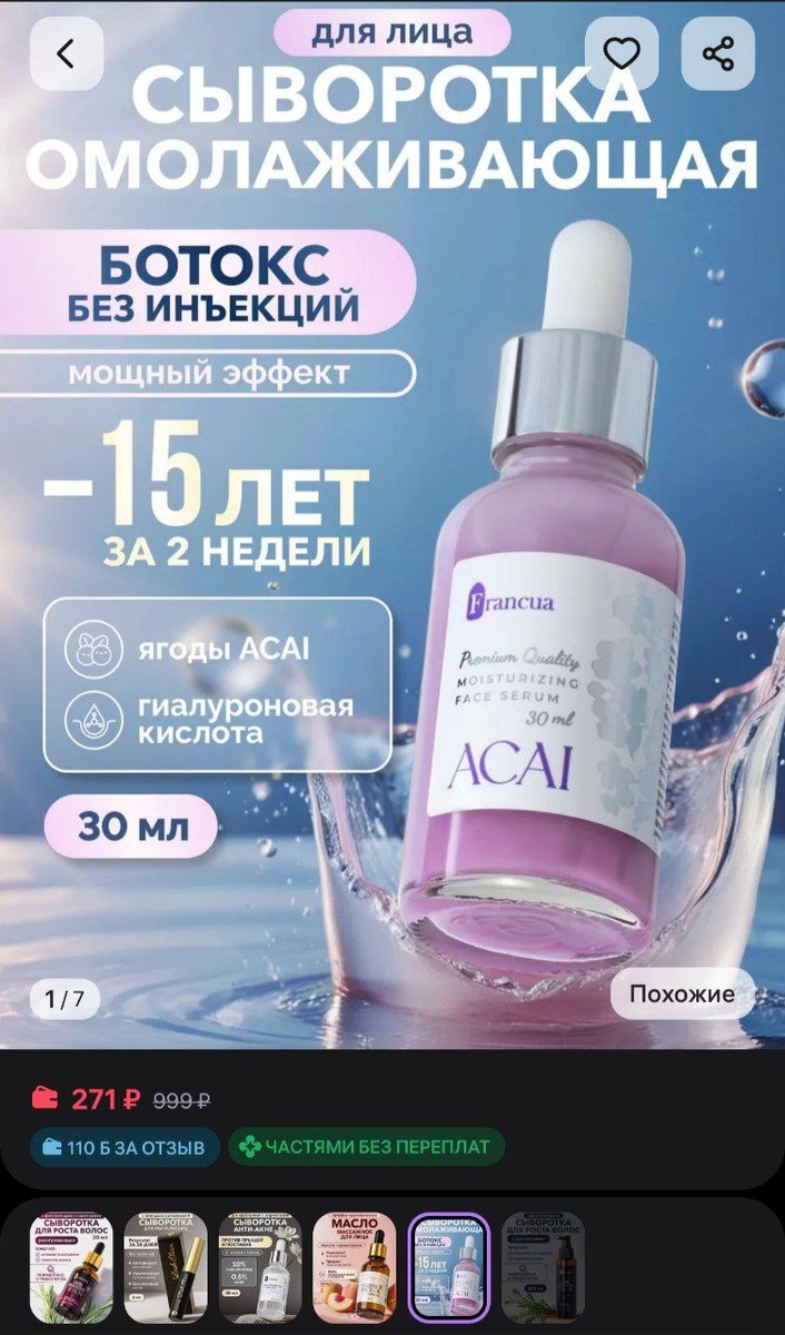 Омолаживающая сыворотка для лица увлажняющая от морщин Francua