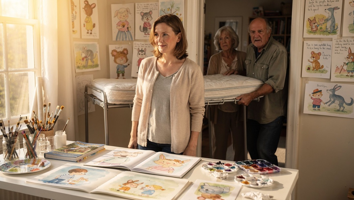 Марина стояла в дверном проёме и не могла поверить собственным глазам. Её рабочий стол — специальный, с наклонной поверхностью, который она заказывала по индивидуальным размерам — уже был сдвинут к стене. На его месте громоздилась старая раскладушка, застеленная пёстрым бельём. А в углу, где ещё утром красовался стеллаж с профессиональными красками и кистями, теперь стоял потрёпанный чемодан на колёсиках.