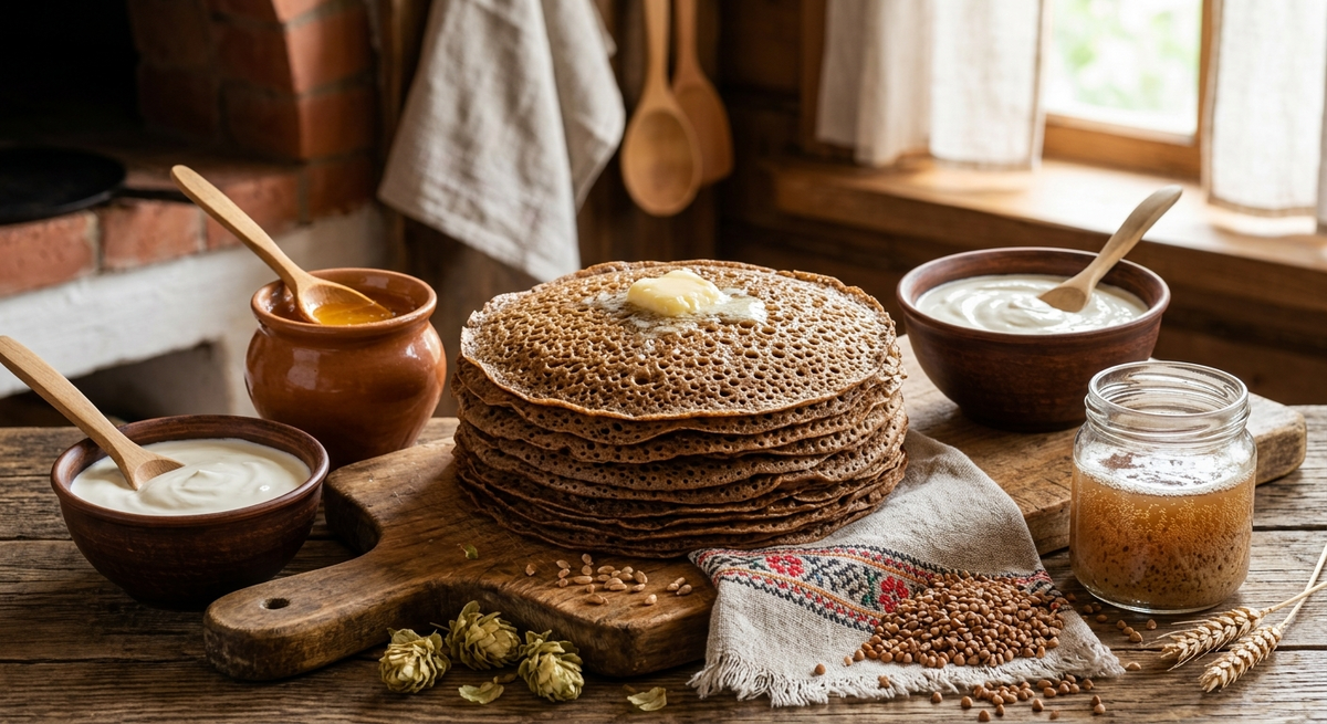 Секрет: квас вместо молока/воды — даёт лёгкую кислинку, активную работу дрожжей и «хлебный» вкус Выход: 12–14 блинов (диаметр 22–24 см) Время: 1 ч 30 мин (включая подъём теста) Ингредиенты: Квас (живой, не пастеризованный), тёплый — 500 мл Мука гречневая — 200 г Мука пшеничная — 150 г Дрожжи: 6–7 г сухих или 15 г свежих Мёд — 1 ст. л. (или сахар — 1,5 ст. л.) Соль — 1 ч. л. без горки Яйца — 2 шт. Масло сливочное (или топлёное), растопленное — 2 ст. л. + для смазывания сковороды Как приготовить: Опара: в тёплом квасе растворите мёд и дрожжи. Вмешайте 200–250 г общей муки (до консистенции густой сметаны). Накройте, оставьте на 40–60 минут — опара должна вспухнуть и покрыться пузырьками. Тесто: добавьте яйца, соль, растопленное масло, остальную муку. Замешайте до консистенции питьевого йогурта; при необходимости подлейте немного кваса или воды. Дайте подойти ещё 20–30 минут. Выпечка: хорошо разогрейте чугунную или тяжёлую сковороду, слегка смажьте маслом. Наливайте тонким слоем, жарьте на