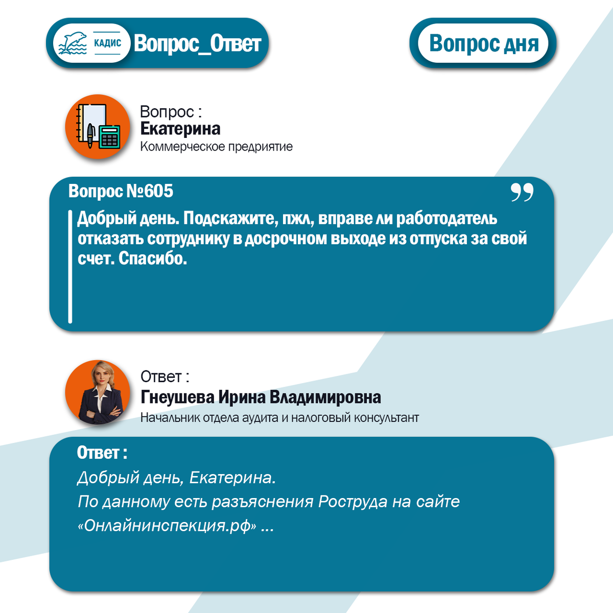 Добрый день, Екатерина. По данному есть разъяснения Роструда на сайте «Онлайнинспекция.рф». Так, согласно статье 128 Трудового кодекса РФ отпуск без сохранения заработной платы предоставляется исключительно по соглашению сторон. Это означает, что и выход из такого отпуска досрочно также требует обоюдного согласия работника и нанимателя. Если работник не относится к льготным категориям граждан (например, пенсионеры, инвалиды, участники ВОВ), которым отпуск «за свой счет» положен по первому требованию в определенные законом сроки, работодатель имеет полное право отказать в прерывании отдыха. При этом, как отмечают специалисты Роструда, объяснять причины своего отказа руководитель не обязан, даже если сотрудник готов вернуться к работе и уведомил об этом заблаговременно. Таким образом, по мнению Роструда, в данной ситуации действия работодателя правомерны.