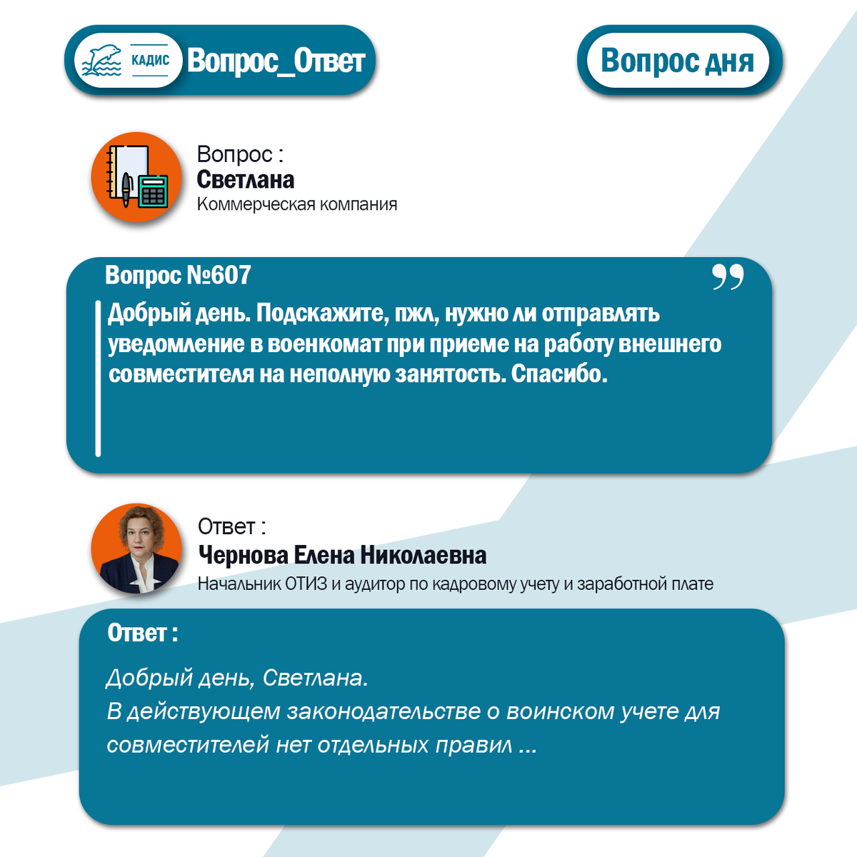 Добрый день, Светлана. В действующем законодательстве о воинском учете для совместителей нет отдельных правил — действуют нормы о воинском учете «граждан по месту их работы (учебы), который ведут организации (п. 9 Положения о воинском учете, утвержденным Постановлением Правительства от 27.11.2006 № 719). На совместителей ведётся воинский учёт по тем же правилам, что и на других сотрудников. Поэтому работодатель обязан передавать сообщение в военкомат при приеме и увольнении военнообязанных совместителей.