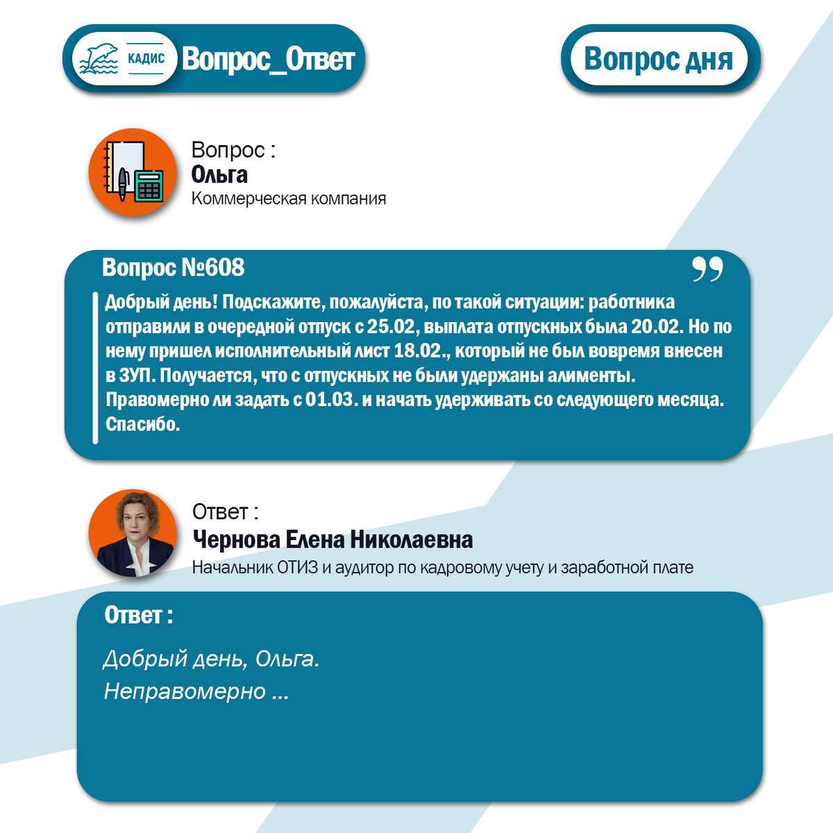 Добрый день, Ольга. Неправомерно. Работодатель обязан начать удерживать алименты со дня получения исполнительного листа. Получив лист, организация должна в течение 3 дней со дня выплаты дохода (зарплаты) сотруднику — перевести алименты взыскателю (ст. 109 СК РФ). В Вашем случае, если лист предоставили 18 февраля, удерживать алименты надо с выплат зарплаты после этого числа, т.е. с отпускных. Работодатель несет риски за нарушения. Если не выполнить требования исполнительного листа, компанию могут наказать по ч. 3 ст. 17.14 КоАП — штраф до 20 тыс. рублей на должностное лицо и до 100 тыс. рублей — на организацию.