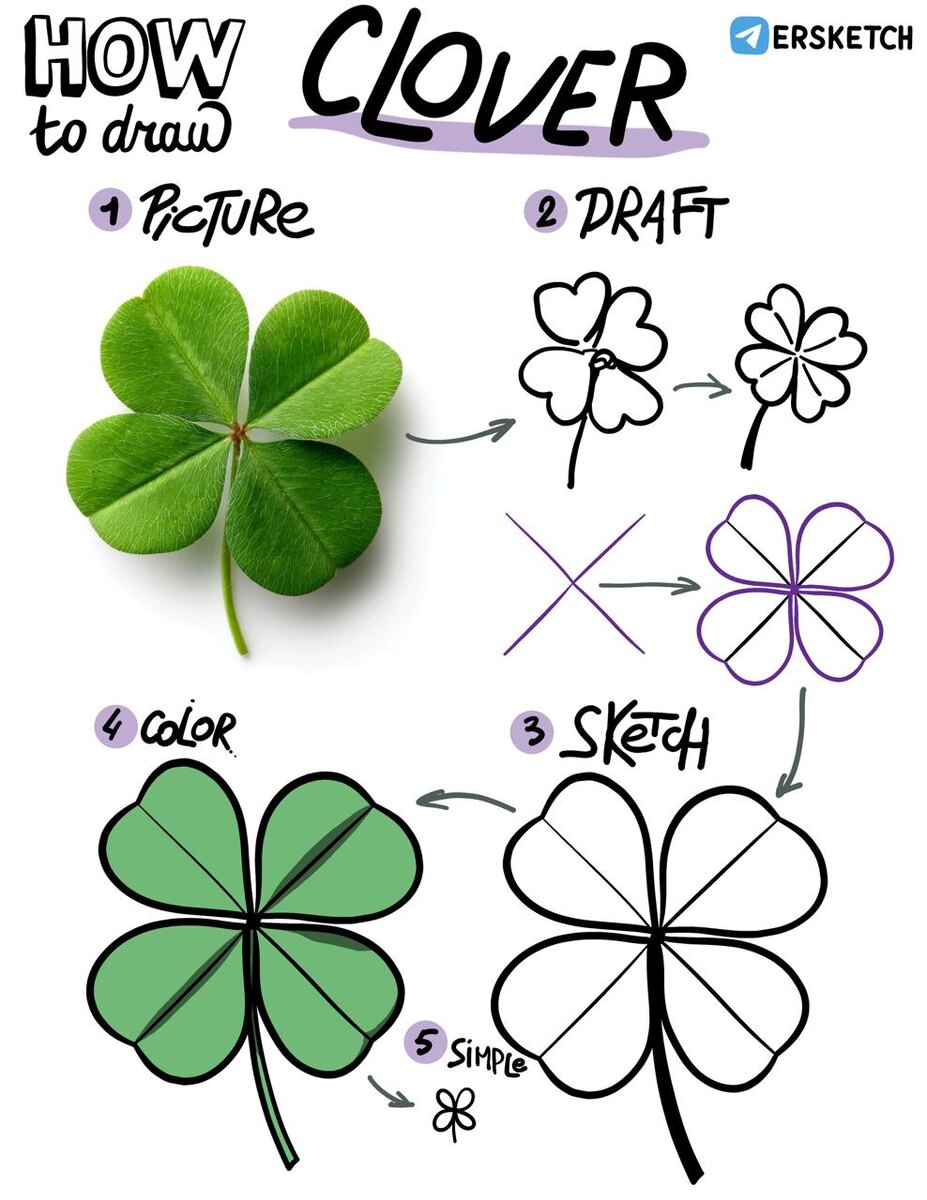 Обычный клевер – трёхлистный. Но всякий знает, что четвёртый лист приносит удачу, так что будем рисовать четырёхлистный. Проще всего нарисовать тонкий диагональный крест, а потом вокруг каждой линии – вытянутое сердечко. Затем снизу пририсовать ножку. С Днём святого Патрика всех!