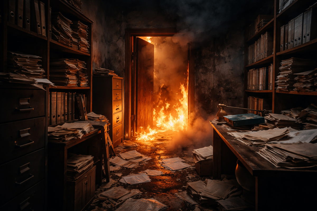 Как будто кто-то положил горящую тряпку или канистровый факел так, чтобы архивная комната сначала задохнулась, а потом вспыхнула сама.