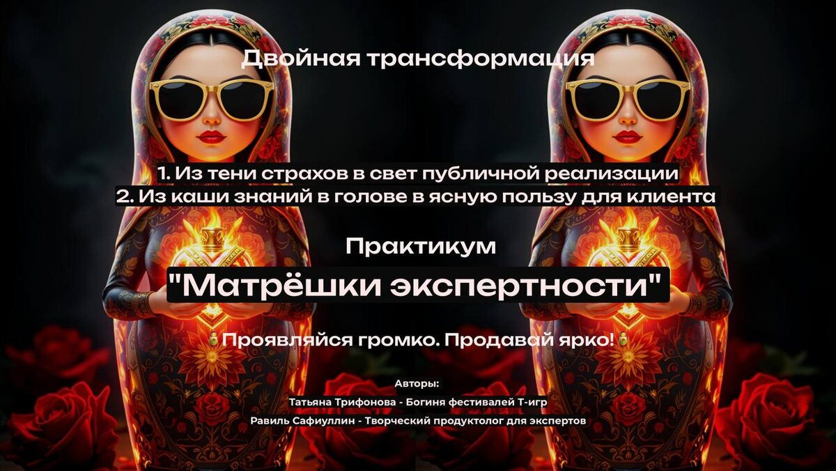 Продавай ярко! 🤑 Такой мы решили выбрать девиз к нашему новому, весеннему, долгожданному... Двойному практикуму 🥁🥁🥁🥁 🪆МАТРЁШКИ ЭКСПЕРТНОСТИ🪆 Как мы говорили раннее, сейчас особая пора, благоприятная для перемен и трансформаций. Было бы жалко её упускать Большая благодарность тем, кто заполнил ту самую анкету Благодаря вашим ответам мы ещё раз увидели две ключевые сложности большинства помогающих практиков Стало ясно, что одним Вип-днём тут не отделаешься, так просто эти проблемы увы не решишь... 📏📏📏📏📏📏📏📏 Сложность номер 1️⃣: "Где и кому мне продавать?" Вести сторисы, писать посты, выкладывать кружочки в каналах, ходить по нетворкингам, платить за рассылки и т.д Всё это вероятно вы пробовали, но результат, скажем честно, так себе. Понимаем Ключевая причина не в инструментах. Она в разрыве между внутренним состоянием и внешними проявлениями И только соединяя внутреннюю опору и внешние действия, появляется настоящая проявленность и отклик людей на вас На практ