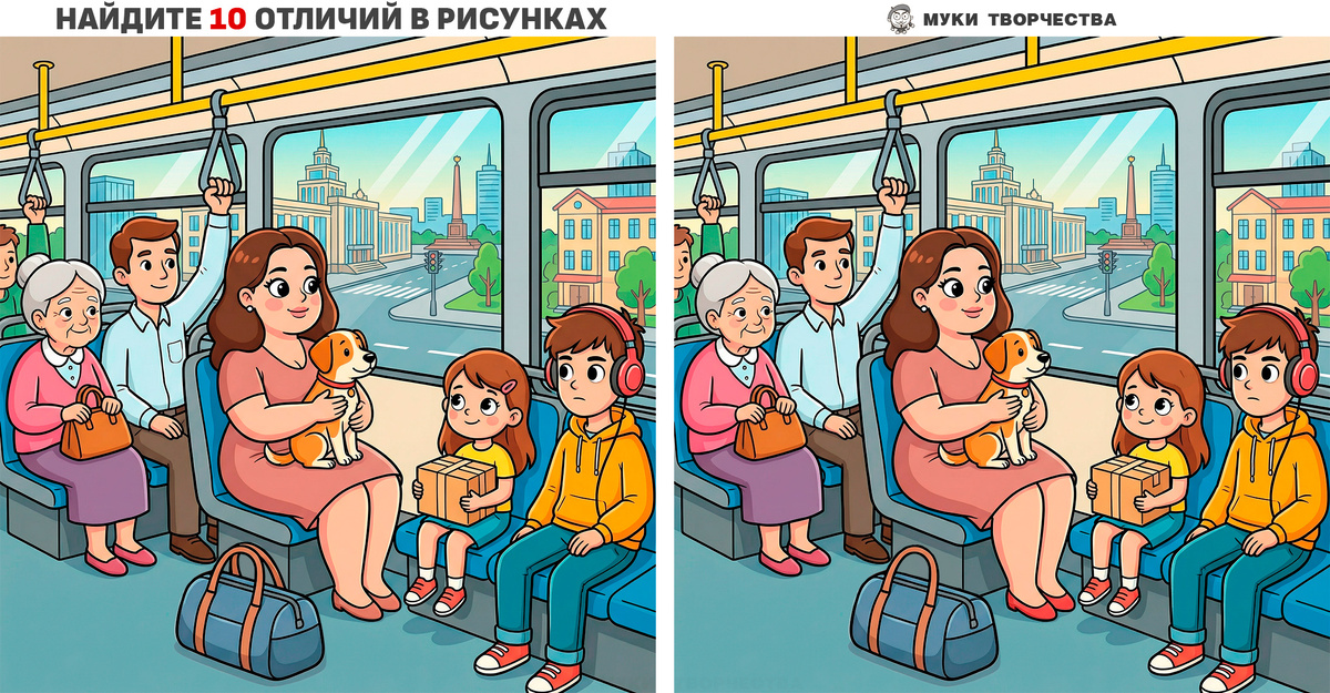 Это тест на внимательность для людей разного возраста. Если разгадывать такие задачки регулярно, то это полезное упражнение на зрительную память и концентрацию внимания. Расслабьтесь и отложите свои дела на пару минут. Внимательно рассмотрите две похожие картинки, где люди едут в автобусе. Найдите 10 отличий, которые ловко припрятал художник. Различия могут прятаться в цвете предметов, в их форме, стёртых или добавленных деталях. Для проверки ваших предположений в конце статьи будет решение. Горизонтальная версия теста: Дорога домой Вертикальная версия теста: Дорога домой Оу! Тут ЕСТЬ ЕЩЁ ТЕСТЫ: РЕШЕНИЕ: