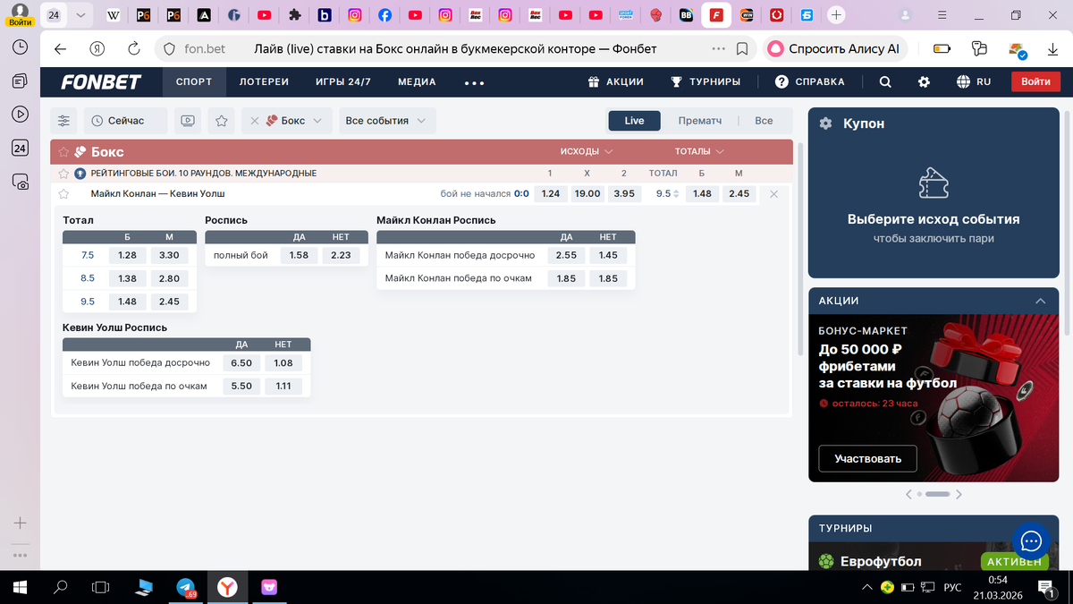 Информация для тех, кто ставит на бокс и в лайве хочет поймать громадный кэф. Наглядный пример Майкл Конлан - Кевин Уолш, это главный бой вечера, который прошел в ночь с 20 на 21 марта 2026 года. В данном противостоянии перед боем были следующие коэффициенты: - на победу Майкла Конлана был кф1.24, на Кевина Уолша кф3.95, но самое удивительное с кэфами происходило в лайве, бой выдался отвратительным, несмотрибельным, нудным, с мизерным количеством ударов с обоих сторон, как легкий спарринг, боксеры скакали весь бой и боялись друг друга ударить, начальные два раунда чуть лучше смотрелся Кевин Уолш, поэтому кэф на него упал до 1.65 в третьем раунде: А потом кэф с каждым раундом возрастал и в конце боя стал аж 13 по линии Фонбет: а на Винлайне был аж кф22: Но стоит отметить, что заключительные два или три раунда чуть лучше был именно Кевин Уолш, возможно поэтому судьи были благосклонны к нему, насчитав в его пользу раздельное решение 96:94, 93:97 и 96:94. Но бой проводился в родн