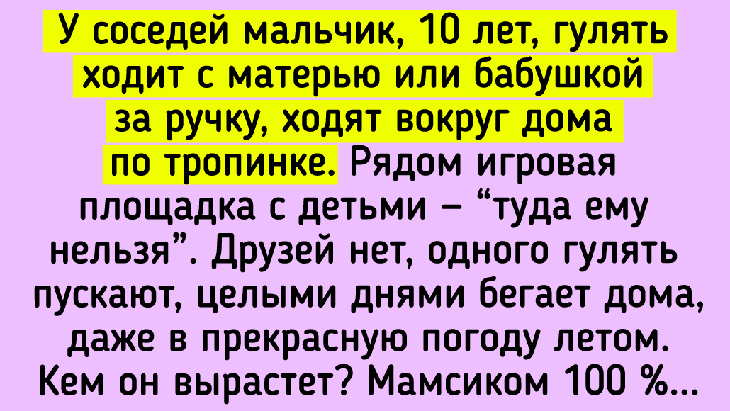 В соседнем доме жила мама с дочкой, а окна моей квартиры выходят на бульварчик, по которому за ручку постоянно гуляла эта пара. Мы думали, что дочка неполноценная. Мама её одевала как маленького ребёнка: странные вещи — капор на голове, ботиночки, пальто с пояском — всё какое-то древнее, немодное. Нос ей платком вытирала, волосы поправляла, а дочка стояла как истукан с пустым взглядом. Так почти 40 лет они гуляли. Мама умерла, и мы просто в шоке были. Доченька приоделась: каблуки, причёска, макияж. Мужичок появился. Глаза блестят. Расцвела! Нормальная она! Почти 40 лет рабства… Жалко её, только жить начала… © Наталья Сученинова / Dzen У меня такой ученик был. Жил с мамой и бабушкой, где отец — не знаю. До 11 класса они его провожали и встречали из школы. Потом — до 3 курса института. Когда парень влюбился и девочка ответила взаимностью, свидания были под присмотром мамы или бабушки. Гуляли всегда втроём. Потом — вчетвером, когда сын родился. Сейчас мужику 44. Ничего не изменилось. Толь