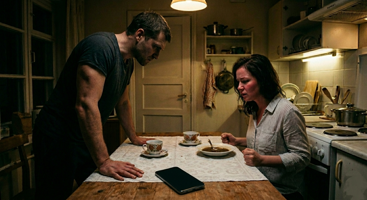 Телефон летит на стол. Грохот такой, что чашки подпрыгивают. Вера вздрагивает, роняет ложку в суп — бульон брызгает на белую скатерть, которую она постелила к его приходу. К приходу. Чтобы всё было красиво. А теперь на ней тёмное пятно, и оно расползается, как та правда, которую он только что увидел.