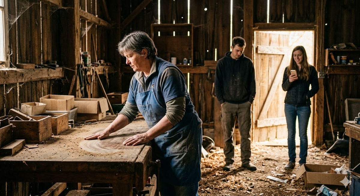 Антонина провела ладонью по столешнице, сдвинув пыль. Под пылью — дерево, тёплое даже здесь, в сыром сарае. Царапина нашлась сразу — она помнила, где.