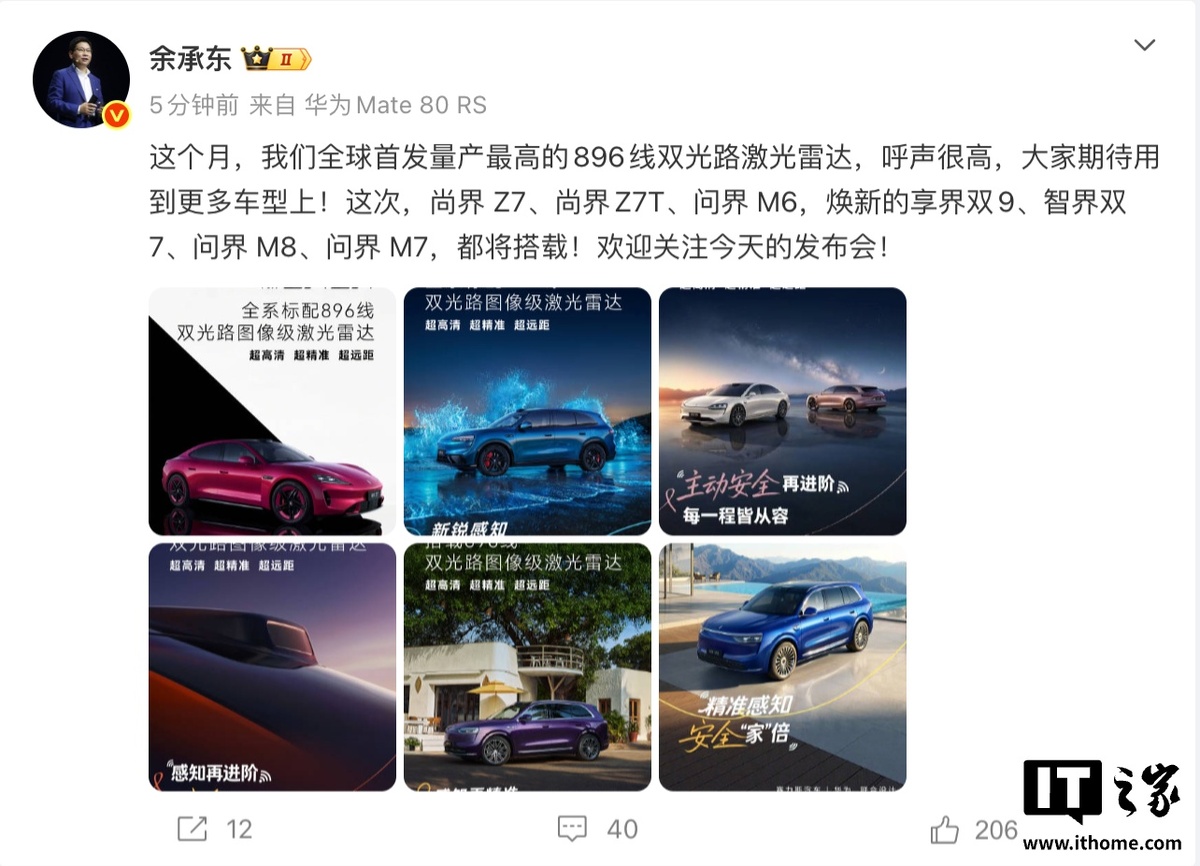 Утром 23 марта управляющий директор Huawei Ю Чэндун опубликовал на своей странице в Weibo весьма примечательное сообщение. По его словам, компании удалось запустить первый в мире серийно выпускаемый двухоптический лидар на 896 линий. Руководитель также подчеркнул, что качество новинки находится на исключительно высоком уровне, а поклонники бренда уже с нетерпением ждут ее появления на других моделях. Устанавливаться новый лидар будет на Shangjie Z7, Shangjie Z7T, Aito M6, а также на новые Xiangjie Double 9, Zhijie Double 7, Aito M8 и M7. Читать на сайте: Huawei запустила лидар на 896 линий — первый такой в мире Что касается технических характеристик нового поколения лидаров Huawei Qiankun с двойным оптическим каналом, стоит отметить несколько ключевых особенностей. Во-первых, устройство обладает рекордными для серийного производства показателями в 896 линий и запатентованной технологией двойного оптического тракта. Во-вторых, два лазерных приемных устройства обеспечивают интегрированну