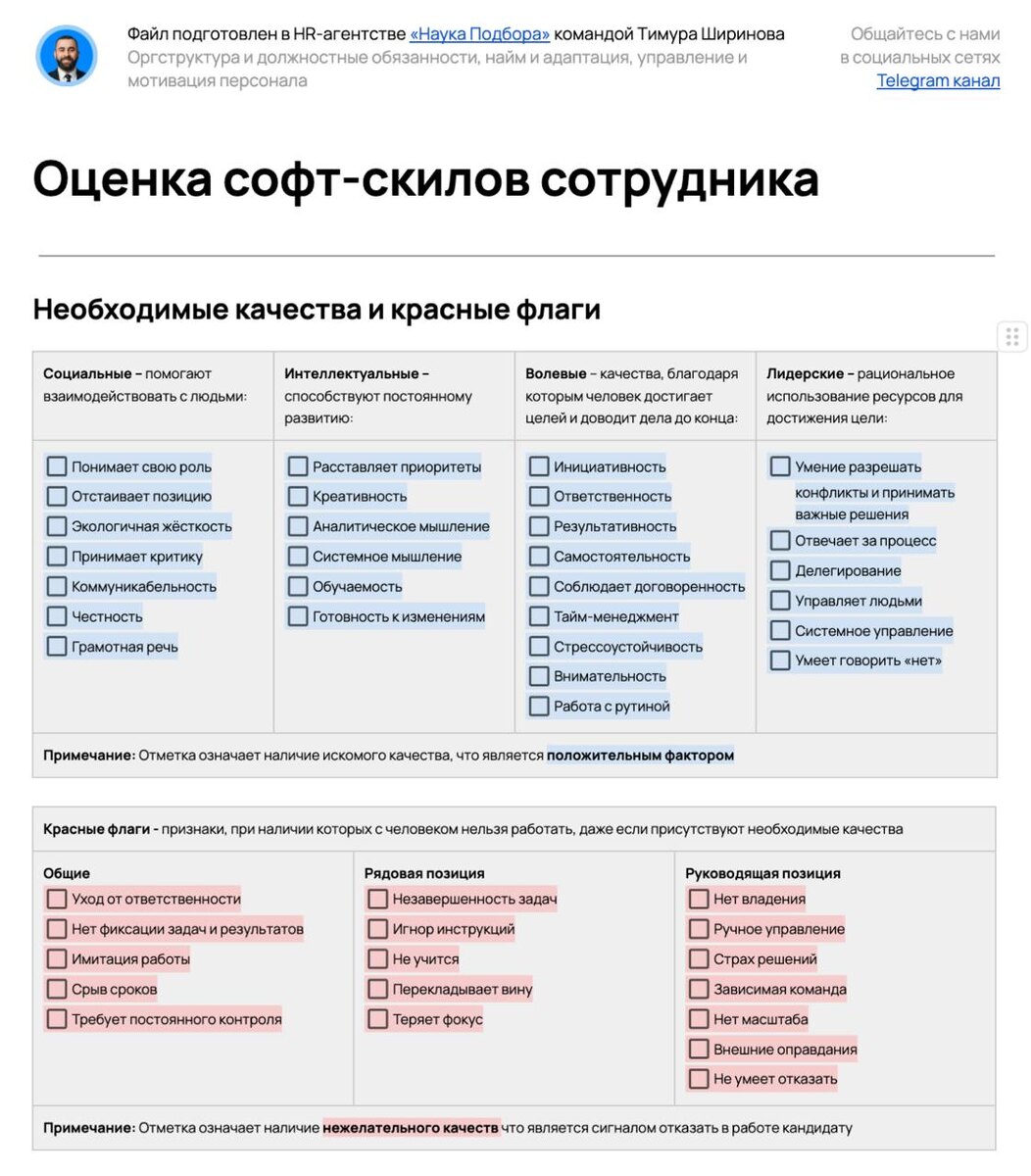 Тот самый, который уже через пару месяцев хочется, как можно быстрее скинуть с себя и больше не вспоминать о нем. Сильный лидер часто совершает одну и ту же системную ошибку. Он верит, что любую деталь можно докрутить до нужного Состояния. Но бизнес - это не плюшевая игрушка, это жесткая конструкция, где каждый элемент имеет свой Предел прочности. Это очень часто проявляется во время испытательного срока при найме сотрудников, где допустив ошибку, некоторые лидеры начинают мучить сами себя мыслями "Надо было еще тогда с ним прощаться". Для себя я давно уже принял - испытательный срок нужен не для того, чтобы научить человека работать. Это этап замера его Сопротивления. Посмотрите на скрин. Мы собрали для вас список софт-скилов, которые должны присутствовать в специалисте и список красных флагов, которые наоборот нужно избегать. Если на испытательном сроке вы видите Красные Флаги из этой таблицы, которые нельзя игнорировать. Ведь Имитация работы или Потеря фокуса - это не случайные сбо