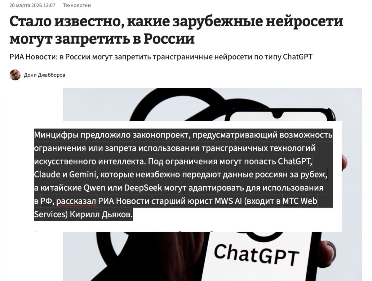Да, друзья, вы верно понимаете: все нейросети, которые и так недоступны для россиян без определённого инструмента на 3 буквы, хотят заблокировать с нашей стороны. Пишут, что закон могут принять 1 сентября 2027 года. Объясните нам, что происходит? Теперь будут блокировать заблокированное? 🧐