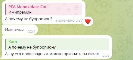 И написал. Я писал спич о бупропионе большой так как это чудо до середины 18 года продавалось на миллионах сайтах как средство бросание для курение за копейки. И никому нужным не было НАХУЙ, И вот почти дописал, на левом мониторе у меня ТГ 27 дюймов, на право все остальное — чтобы закинуть скрин и когда ввел мышку умудрился провести по самому крайнему правому краю и случайно ЗАКРЫВ ТГ и пост не сохранился (чистый текст у ТГ в черновиках, а если там есть изображение НЕТ). Я не мистик, но у меня разу в жизни такого совпадения не было.. Это проведения. Но что уж скринов, то 🤡 в реакции вернул после этого диалога. Пользуйтесь, но разумно. Сразу говорю я на свой пост сейчас и поставлю клоуна. Хотя ни разу не ставил лайки на свои посты. Это даже для меня слишком...