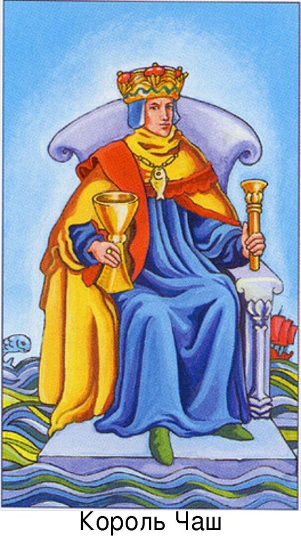 Король кубков проявляет уравновешенность и спокойствие. Он добрый, светлый и милосердный. Надёжный друг, любящий отец. Король кубков умело управляет своими чувствами и эмоциями. Знает чего он хочет. В минусе это бесхребетность, пристрастие к спиртным напиткам, любовь к самообману. Он может вас хитро затянуть в свои сети, а потом сказать, что он ничего для этого не делал. Может манипулировать