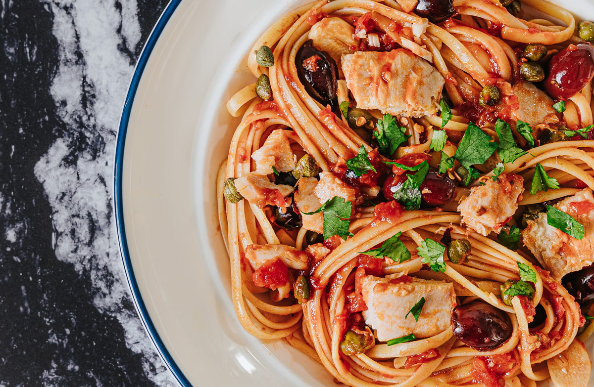Источник: https://tastecooking.com/this-15-minute-pantry-puttanesca-is-a-flavor-heavy-hitter/?ref=PRHB750D7B443E6&linkid=PRHB750D7B443E6&cdi=8FD6F71CA07B70AA325A4385D8B2A072&template_id=39695&aid=randohouseinc27406-20&link_location=21_65 Готовка — моя работа: я пишу об этом, преподаю и занимаюсь этим весь день. Иногда к ужину просто не остаётся сил. Мне нужен быстрый приём пищи, который не требует заморочек и, что самое важное, не оставляет кучи посуды. Моё решение — своего рода путтанеска, где консервированный тунец заменяет классические анчоусы для дополнительного белка и насыщенности. (Это вольно вдохновлено pasta al tonno, другой итальянской пастой с помидорами и тунцом.) Кроме нарезки пары зубчиков чеснока, вам почти не понадобится разделочная доска — остальные ингредиенты готовы к употреблению прямо из упаковки, что делает это блюдо идеальным для ленивого вечера. Путтанеска опирается на яркие вкусы — солёные оливки и пряные ка