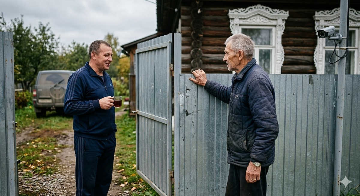 Мужчина в спортивном костюме вышел с кружкой. За спиной — собака, вольер, камера на столбе. Ничего знакомого, кроме одного.