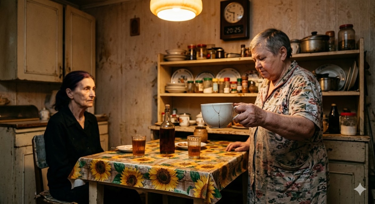 Наталья придёт через двадцать минут. Каждый вечер, без звонка, без предупреждения — просто стук в дверь, и Зоя открывает, и на столе уже два блюдца и два пакетика мяты. Полвека так. С того дня, когда обе были восемнадцатилетними и Наталья переехала в соседнюю квартиру с картонными коробками и матерью, которая кричала на весь подъезд.