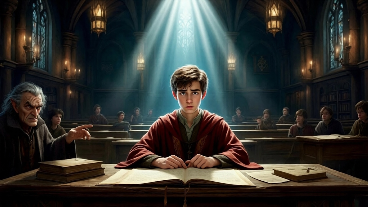 Вошёл магистр Теоремус. Это был сухой старик с длинной седой бородой и такими кустистыми бровями, что казалось, будто у него на лице сидят две мохнатые гусеницы. Он оглядел аудиторию, и его взгляд остановился на мне.