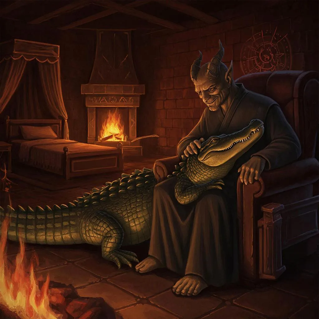 Сам Саллос уже переоделся в длинный тёмный халат и сидел в глубоком кресле у огня. На его коленях, свернувшись клубком и положив массивную голову ему на ногу, спал Саллиэль. Демон лениво почёсывал крокодила за ухом, отчего тот издавал звуки, похожие на мурлыканье потревоженного дракона.