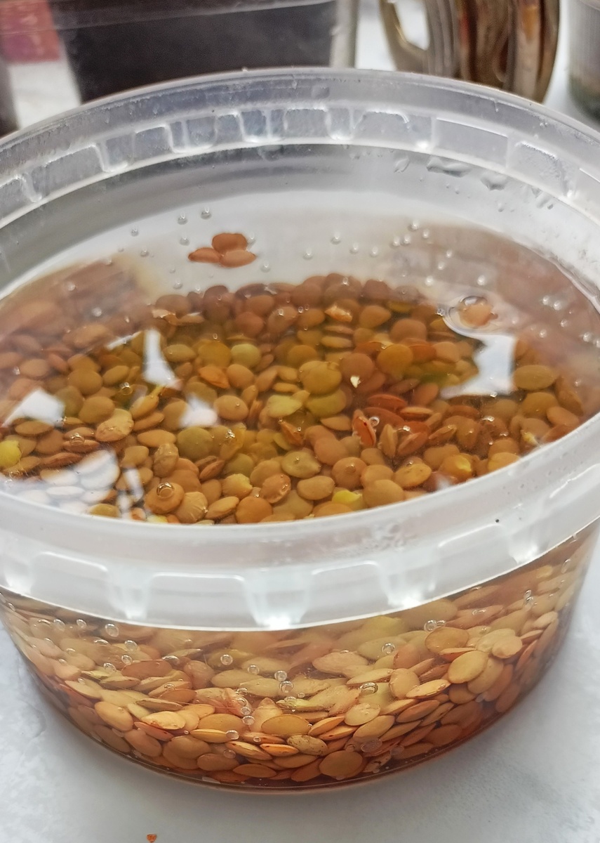 Сейчас весна, после зимы нехватка витаминов, предлагаю рецепт вкусного и полезного салата. Для проращивания берем чечевицу или маш. В этот раз я использовала чечевицу 100 грамм, я примерно обычно насыпаю. Заливаем прохладной водой больше по объему раз в 5 и оставляем на 6-7 часов, можно с вечера залить, а утром сливаем воду и прикрываем крышкой. Три раза в день надо промывать холодной водой чечевицу и сливать воду. У меня баночка с чечевицей стоит на столешнице в кухне. Через 4 дня получаем такой результат. Показались корешки и росточки. Теперь немного терпения -отделить кожицу, я обычно сажусь смотреть кино и время пролетает незаметно. Перед готовкой салат я замачиваю соленый папоротник на 2 часа, меняя воду чтобы избавить от соли. Пробуем, если соль практически не ощущается, нарезаем папоротник(200гр) и лук 1 шт. На сковороде нагреваем 2 стол. ложки подсолнечного масла, слегка обжариваем лук. Затем сверху лука насыпаем специи на свой вкус, я люблю паприку, хмели-сунели, имбирь и ч
