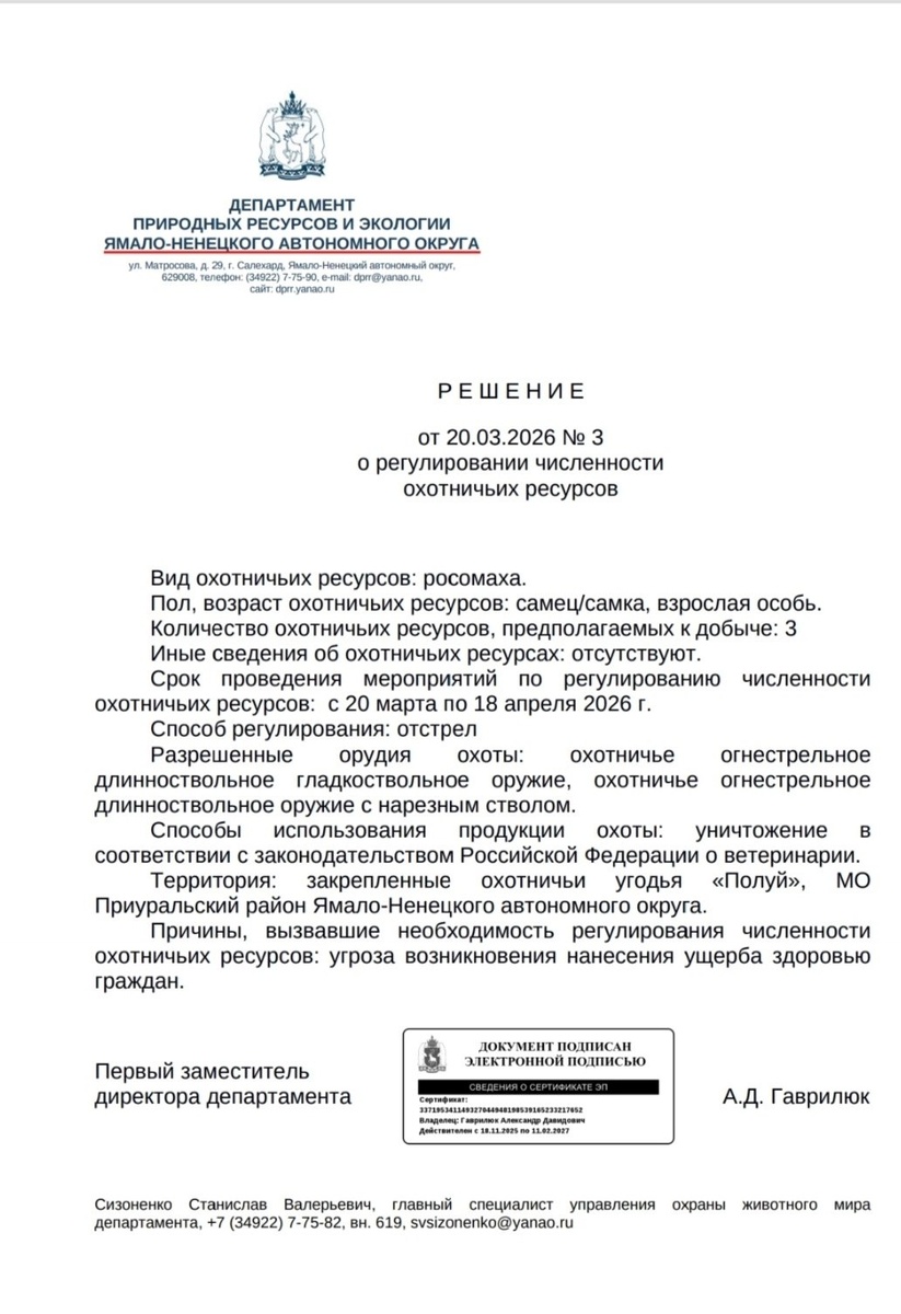 Соответствующее постановление размещено на сайте департамента природных ресурсов и экологии ЯНАО. Отстрел трёх взрослых особей пройдёт в охотничьих угодьях «Полуй» в период с 20 марта по 18 апреля. Охотникам разрешат использовать гладкоствольное и нарезное огнестрельное оружие. Добытых животных утилизируют в соответствии с ветеринарными нормами.