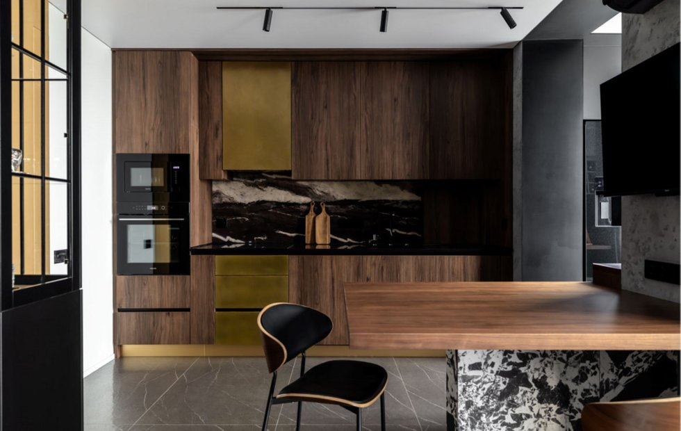 Кухонные фасады покрыты натуральной латунью, а уникальный рисунок фартука был достигнут с помощью сложной техники нанесения декоративной штукатурки — результат потребовал нескольких попыток, но полностью оправдал усилия.