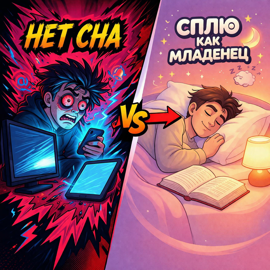 Мелатонин — это гормон сна. Он начинает вырабатываться, когда темнеет. Синий свет от экранов (телефона, ноутбука, телевизора) обманывает мозг: он думает, что ещё день. Мелатонин перестаёт вырабатываться.