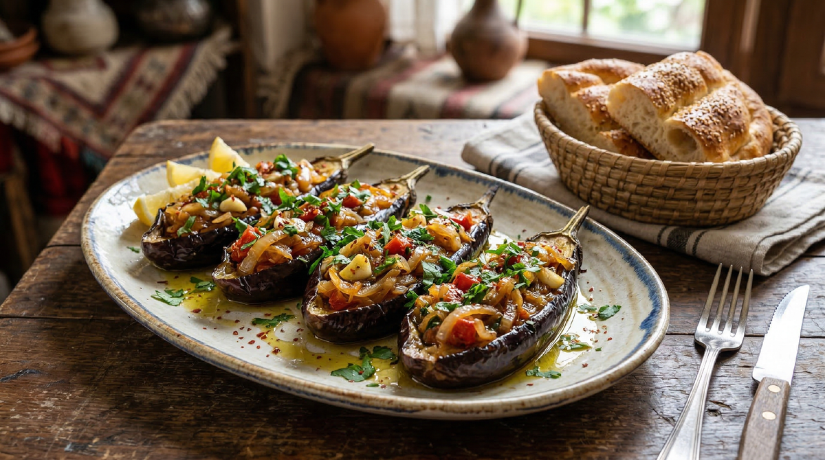 Дома я подаю с любым хорошим хлебом — подойдёт и чиабатта, и обычный белый батон, и лаваш. Иногда ставлю рядом миску с густым натуральным йогуртом — это тоже очень по-турецки и отлично сочетается с баклажанами. Кислинка йогурта красиво контрастирует со сладостью томатной начинки.