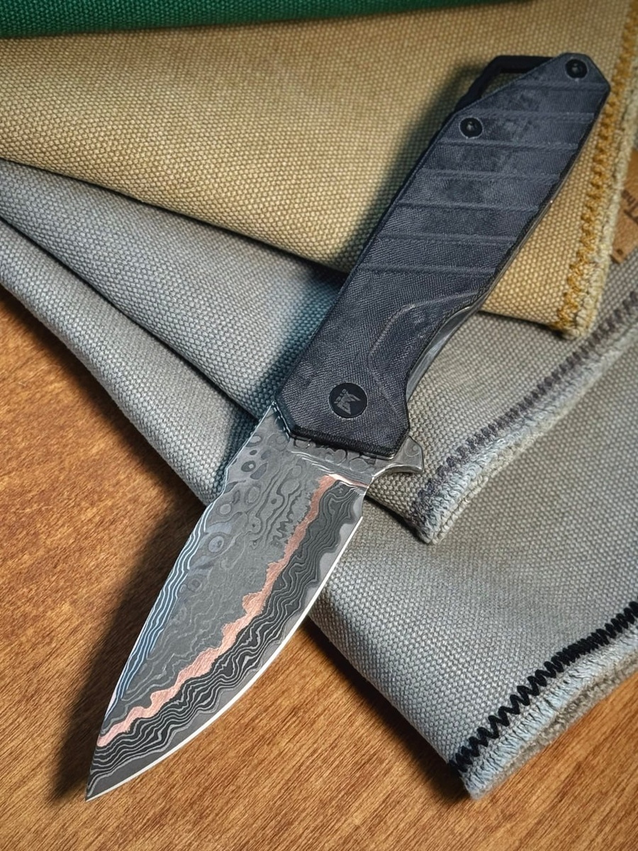 На клинке ламинат через медь с центром из стали VG-10, а на рукояти микарта.