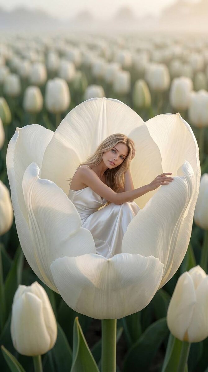 : Где-то между мечтой и реальностью 🌷 ➡️ Зайдите в ГЛАВНОЕ МЕНЮ ➡️ Нажмите «Сгенерировать» ➡️ Выберите PRO - режим ➡️ Затем Nano Banana фото -> PRO ➡️ Загрузите фото в хорошем качестве ➡️ Вставьте промпт Ultra-realistic macro fashion scene, vertical composition, shot on a medium-format camera with an 80mm f/2.8 lens. A fully opened white tulip fills almost the entire frame. The delicate white petals are highly detailed, showing natural veins, soft translucency and gentle curvature. The petals wrap around the center of the flower, forming a natural cradle. Deep inside the heart of the tulip sits a tiny miniature woman (approximately the size of a thumb). The petals surround and partially frame her body, creating the feeling that she is hidden safely inside the flower. Pose: She sits softly within the flower’s center, knees slightly bent, one arm resting lightly on a petal while the other hand gently touches the edge of the tulip. Her posture is calm, elegant and slightly dreamy,
