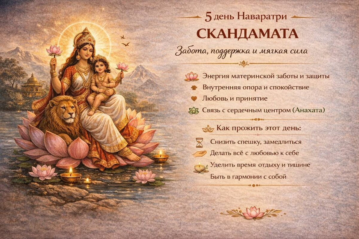 Пятый день посвящён Богине Скандамате — матери, держащей на руках своего ребёнка. Её изображают сидящей на лотосе — символе чистоты и внутреннего покоя, даже когда вокруг неидеальные условия. Это образ силы через любовь и принятие. 🌿 Значение в традиции В классике ей приписывают: - энергию материнской заботы и защиты - способность давать безопасность и опору - связь с сердечным центром (Анахата) - мягкую, но очень устойчивую силу Считается, что через Скандамату человек получает внутренний покой и благословение. ✨ Про что этот день: После активных и более «сильных» дней наступает момент: 👉 перестать давить на себя и начать себя поддерживать Это день, когда важно заметить: - в каком я состоянии - где мне сейчас непросто - хватает ли мне ресурса 🌿 Как это проявляется в жизни В этот день Вы можете почувствовать: - желание уюта и тишины - больше чувствительности - потребность в поддержке - желание замедлиться 🌱 Что даёт энергия Скандаматы Если прожить этот день в контакте с собой, о