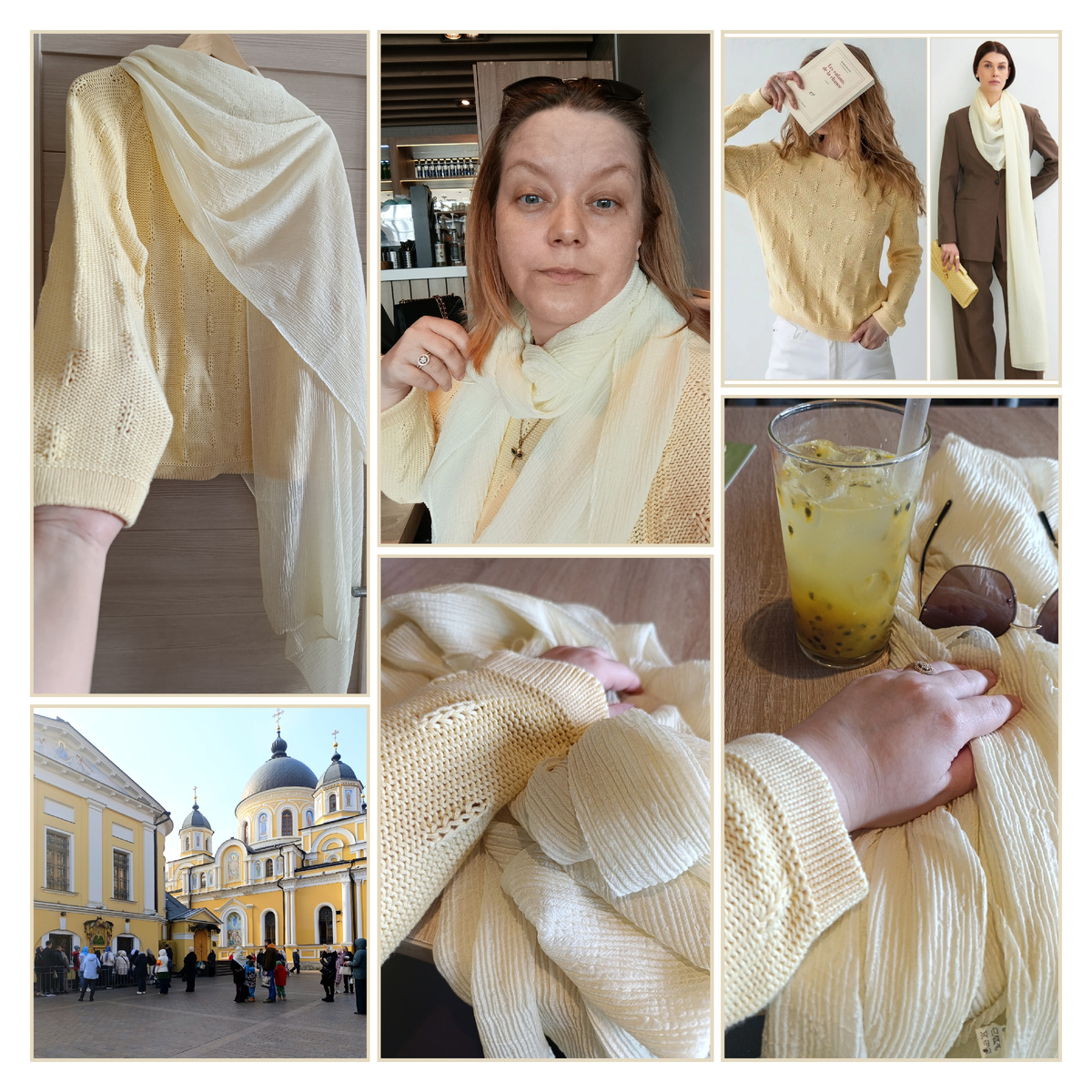 В моем гардеробе много молочного, светлого. Есть молочный свитер, светлые блузки, светлая куртка. Желтый палантин встраивается в эту светлую палитру, не выпадая из общей цветовой концепции. Он не требует покупки «дополнительных вещей под него» — он работает с тем, что уже есть. Это и есть разумное инвестирование в гардероб.