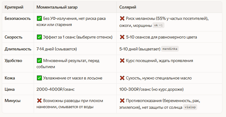 Хотите золотистый оттенок без пляжного отпуска? Моментальный загар и солярий — два популярных способа. Но какой безопаснее и удобнее? Разбираем плюсы, минусы и делаем выбор на основе фактов. Нанесение специального лосьона с DHA (дигидроксиацетоном) — сахаром, который реагирует с белками кожи, окрашивая верхний слой. Процедура в салоне занимает 15-30 мин, эффект проявляется за 6-12 часов и держится 7-14 дней. УФ-лампы имитируют солнце: UVA-лучи стимулируют меланин в коже. Сеанс 5-15 мин, загар нарастает постепенно (5-10 сеансов). Держится 5-10 дней. Ключевой плюс моментального загара: полная безопасность — идеально для чувствительной кожи. Солярий дает витамин D и адаптацию к солнцу, но ВОЗ относит его к канцерогенам. Минус: не защищает от солнца — используйте SPF 50+! Минус: не чаще 2-3 раз в год, лампы до 600 часов. Моментальный загар выигрывает: безопасность + скорость для 90% случаев. Солярий — только для здоровых, с контролем времени. Комбо: моментальный перед отпуском + солярий д