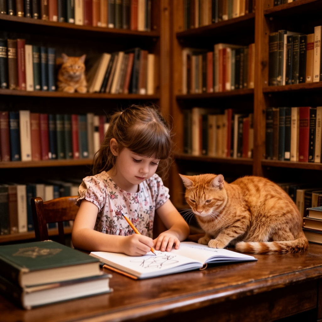 Мама подошла к окну, удивлённо глядя на внезапный дождь. А девочка рисовала дальше. Теперь на странице появлялся кот — рыжий, пушистый, точь-в-точь Шрифт. И когда она дорисовала усы, Шрифт почувствовал, как его собственная шерсть встаёт дыбом, а из горла само собой вырывается: