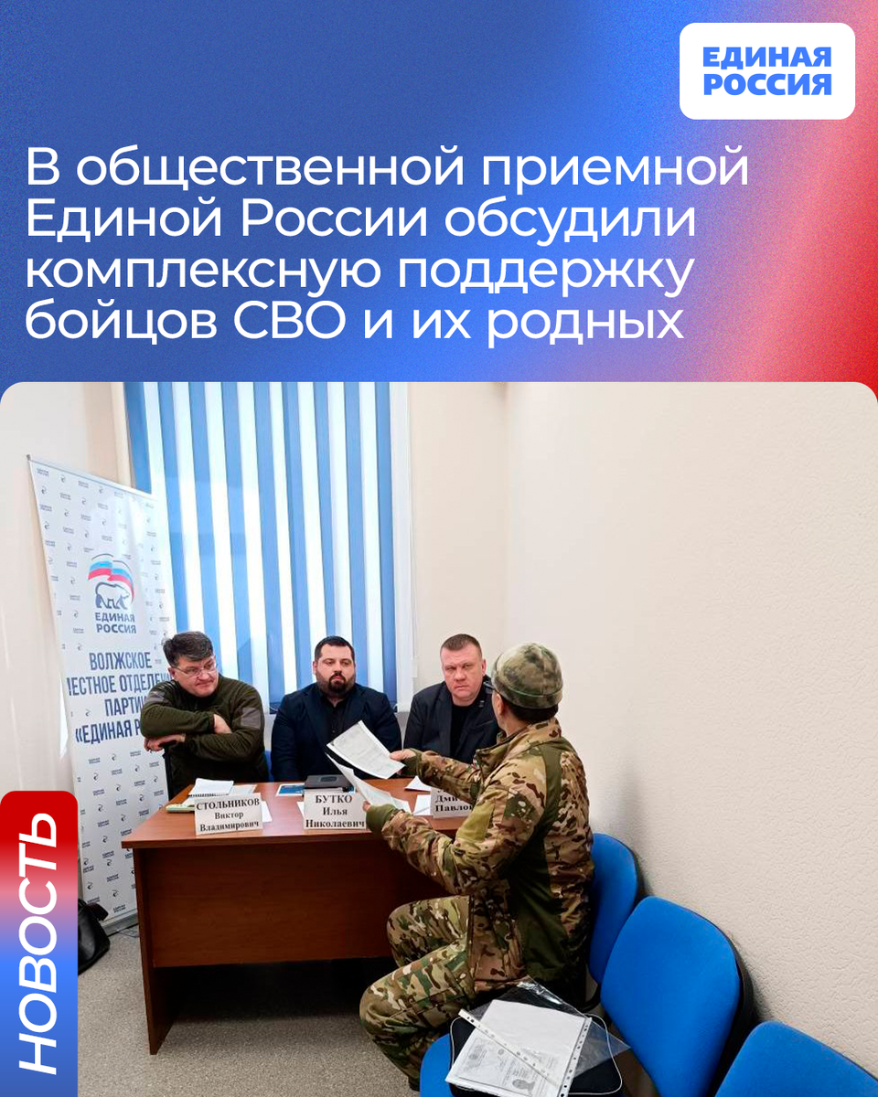 В Волжском местном отделении партии личный прием провели секретарь местного отделения, депутат Областной Думы, ветеран СВО Дмитрий Лыгин, военврач, член местного политсовета, ветеран СВО Виктор Стольников и председатель Торгово-промышленной палаты Саратовской области, член местного политсовета Илья Бутко.