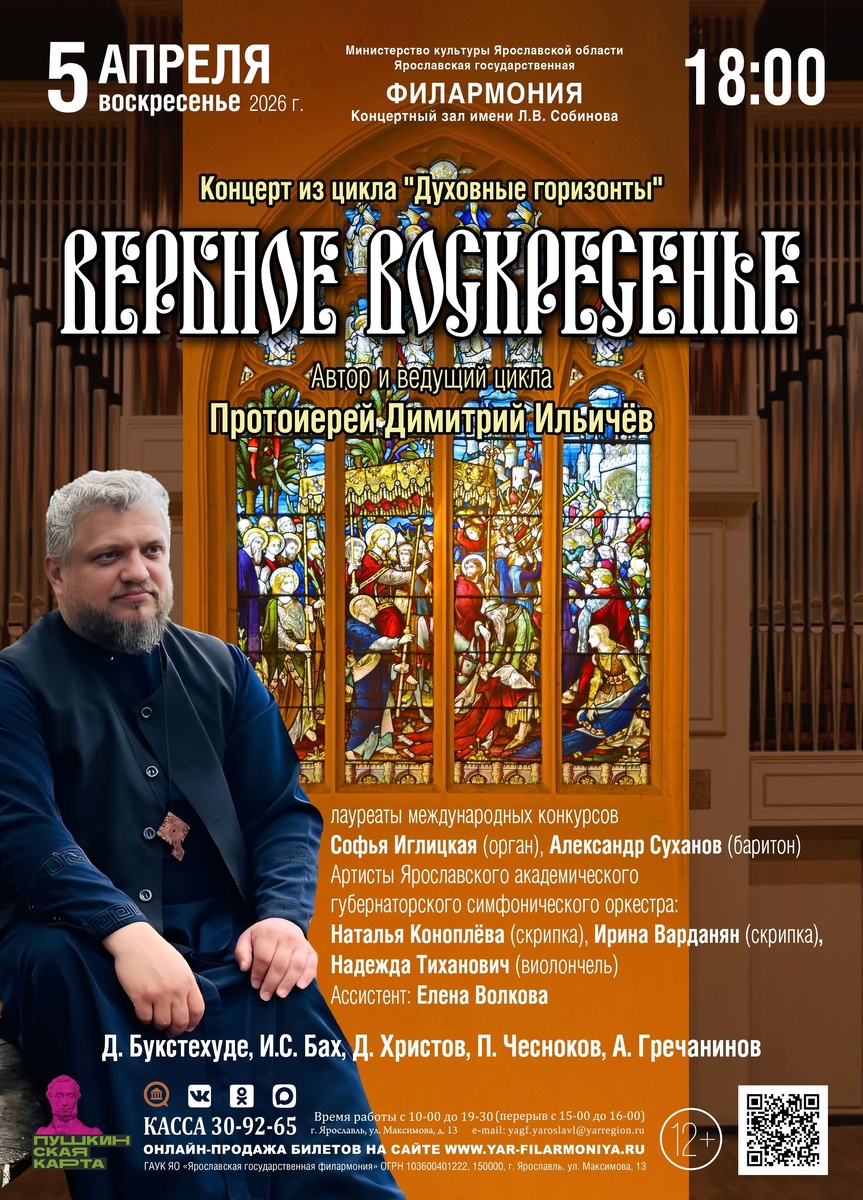 В Вербное воскресенье, 5 апреля в 18:00, приглашаем на концерт из цикла «Духовные горизонты», где музыка станет проводником к самым глубоким чувствам и мыслям. https://clck.ru/3ShdiK В программе концерта строгая и возвышенная красота немецкого барокко Баха и Букстехуде, широта и сердечность русской духовной традиции, представленная сочинениями Чеснокова, Архангельского и Гречанинова. Каждое произведение - молитва, исповедь и откровение. От монументальных органных прелюдий, уносящих мысль к небесным сферам, до тихой скорби и светлой надежды в ариях - музыка очищает и наполняет сердце светом. Проводником в этом духовном путешествии станет автор и ведущий цикла - протоиерей Димитрий Ильичёв. 🙏 На сцене для вас: 👏Софья Иглицкая (орган) 👏Александр Суханов (баритон) 👏👏👏Струнное трио в составе артистов Ярославского академического губернаторского симфонического ор Показать полностью...