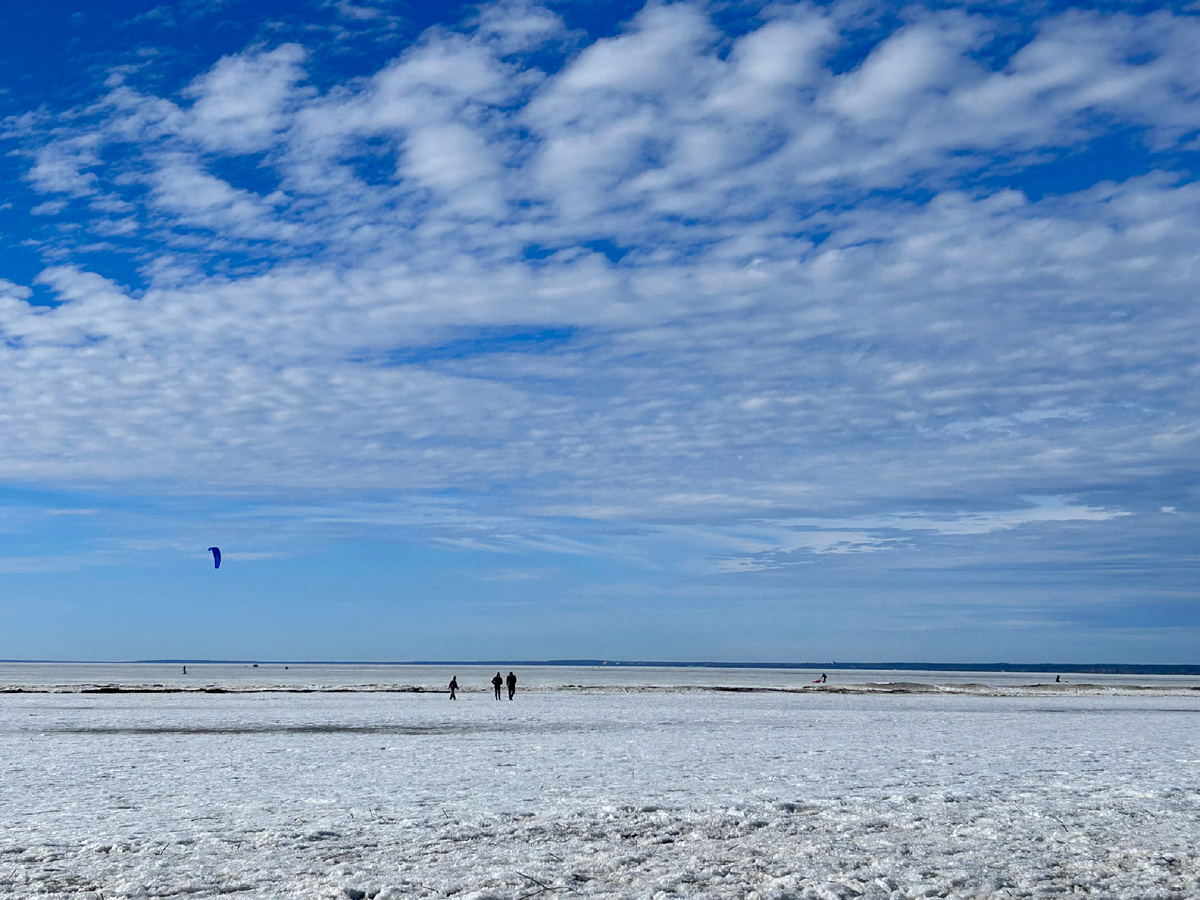 Как только усилился ветер, сразу появились любители кайтсёрфинга на снегу. Яркие купола небольших парашютов (кайтов) смотрятся очень красиво на синем небе.