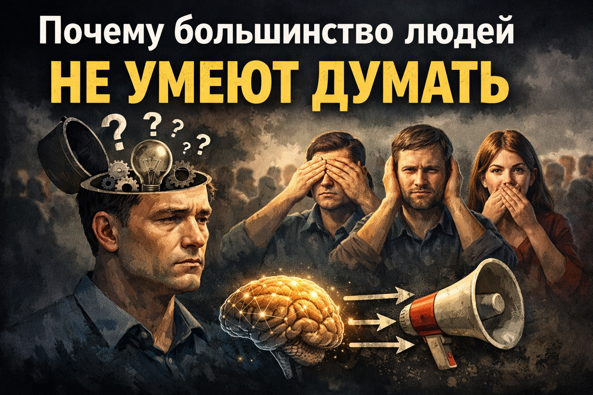 ®Владислав Лозовой Но если посмотреть на решения людей — становится ясно, что думать умеют далеко не все. Они принимают решения, делают выводы и рассуждают о происходящем. Но если внимательно посмотреть на то, как люди приходят к своим выводам, можно заметить одну важную вещь: чаще всего люди не думают, а просто повторяют чужие мысли. Есть несколько причин. Первая — система образования. Она в основном учит запоминать информацию, а не понимать процессы. Человек запоминает факты, формулы и теории, но редко учится задавать вопросы: Вторая причина — влияние авторитетов. Люди часто принимают мнение эксперта как истину. Это удобно: