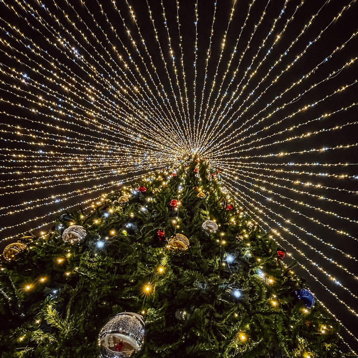 Когда мы говорим о создании по-настоящему волшебной атмосферы на Новый год, одной гирлянды на дереве уже недостаточно. Современная новогодняя иллюминация стремится к иммерсивности — эффекту полного погружения в сказку. Именно эту задачу решают елки со световыми шатрами. Это не просто украшенное дерево, а архитектурно-световая композиция, которая преображает пространство и дарит незабываемые эмоции. В этой статье мы расскажем, что представляет собой елка с шатром, в чем преимущества такого решения и почему купол с елкой становится главным трендом городского и коммерческого оформления. Конструкция представляет собой сочетание классической уличной ели и навесного светового купола. Елка со световым шатром — это единая композиция, где дерево находится под полусферическим или конусообразным навесом, полностью покрытым светодиодными нитями. В отличие от простой уличной елки с гирляндой, здесь световая инсталляция охватывает не только дерево, но и пространство вокруг него, создавая закрытую св