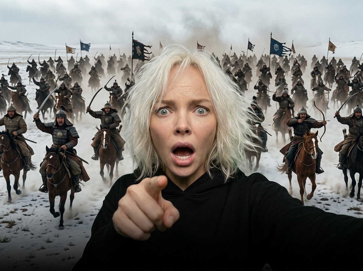 Значит, слушайте. Я просто хотела попробовать один ИИ-инструмент. А очнулась посреди монгольского нашествия. Худи, телефон в руке, и вокруг — тысячи юрт и запах дыма. Ну окей. Снимаю контент. Первое что я увидела — огни. Сотни огней до горизонта. Юрты. Тысячи юрт. Снег, дым, где-то вдали что-то горит — и тишина такая, что слышно как трещит лёд под ногами. Я стою на холме и смотрю на всё это и думаю одну мысль: это не Airbnb который я бронировала. Монгольский лагерь XIII века — это не то что показывают в учебниках. Это живой организм. Огромный, тёмный и абсолютно уверенный в себе. Потом я спустилась вниз. И пожалела. Снег, щиты, копья. Люди которые час назад были живыми. Вдалеке — всадники уходят, крепость догорает. Я стою посреди всего этого в своём чёрном худи и понимаю: вот так выглядит история которую потом напишут в книгах. Не героически. Не красиво. Просто — поле. Снег. И тишина после. Знаешь что самое странное? Я не могла отвести взгляд. Это было настолько настоящим, что забываеш
