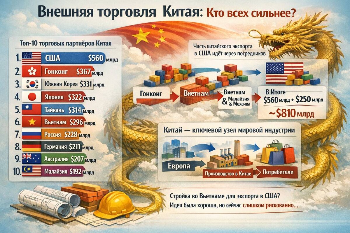 Крупнейшие торговые партнёры Китая (ТОП-10): 1. Соединённые Штаты Америки — 560 млрд $ 2. Гонконг — 367 млрд $ 3. Южная Корея — 331 млрд $ 4. Япония — 322 млрд $ 5. Тайвань — 314 млрд $ 6. Вьетнам — 296 млрд$ 7. Россия — 228 млрд $ 8. Германия — 211 млрд$ 9. Австралия — 207 млрд $ 10. Малайзия — 192 млрд $ Китайские аналитические площадки продолжают обсуждать результаты прошлого года. Один из популярных тезисов — реальный объём торговли с Соединённые Штаты Америки выше официальных цифр. Часть китайских товаров попадает туда через посредников — прежде всего через Гонконг, Вьетнам, Малайзия и Мексика. Если учитывать этот поток, объём поставок оказывается значительно больше прямого экспорта. Другой распространённый тезис: Европа и США остаются рынками конечного потребления. При этом Китай — не просто экспортёр, а центральное звено глобальной производственной системы. В этом есть рациональное зерно. Например, мы сами рассматривали проект: запустить во Вьетнам небольшое производство стро