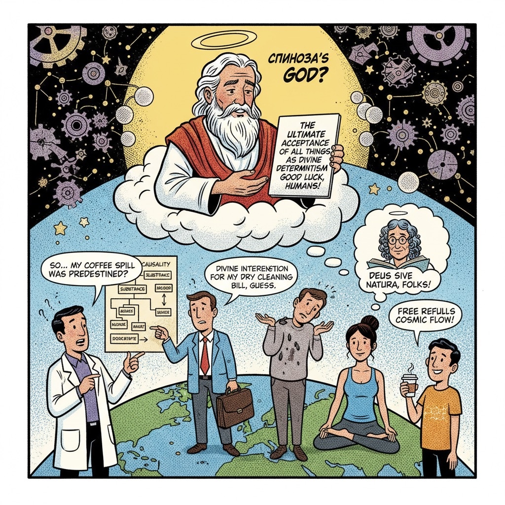 Но есть ещё одна фигура, которая заставляет нас взглянуть на неизбежность глубже. Великий философ Бенедикт Спиноза когда‑то убрал противоречие между религией и наукой. Он не противопоставлял их, как, к сожалению, делают многие, а соединил вместе — примерно как пиццу с ананасами: кто‑то до сих пор в шоке, а кто‑то считает это гениальным сочетанием. Его главный тезис: Бог и природа — это единое целое. Воля высших сил и законы этой природы — неразрывны. Удивительная, необычная для своего времени теория, которая, кстати говоря, привела Спинозу к изгнанию из общины (видимо, тогда ещё не оценили его новаторский подход). Но нам она полезна тем, что объясняет: всё, что с нами происходит, включая испытания, — это не случайный каприз, а абсолютно закономерный, естественный процесс в соответствии с законами природы, общества и материи.
