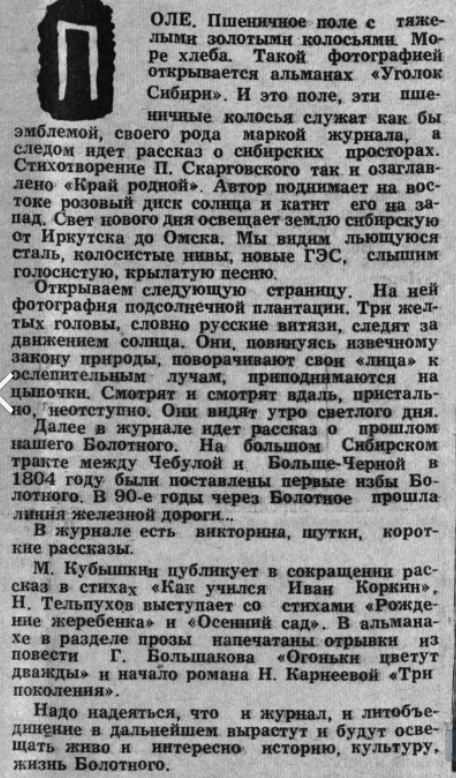 Поле. Пшеничное поле с тяжелыми золотыми колосьями. Море хлеба. Такой фотографией открывается альманах «Уголок Сибири». И это поле, эти пшеничные колосья служат как бы эмблемой, своего рода маркой журнала, а следом идет рассказ о сибирских просторах. Стихотворение П. Скарговского так и озаглавлено «Край родной». Автор поднимает на востоке розовый диск солнца и катит его на запад. Свет нового дня освещает землю сибирскую от Иркутска от Омска. Мы видим льющуюся сталь, колосистые нивы, новые ГЭС, слышим голосистую, крылатую песню. Открываем следующую страницу. На ней фотография подсолнечной плантации. Три желтых головы, словно русские витязи, следят за движением солнца. Они, повинуясь извечному закону природы, поворачивают свои «лица» к ослепительным лучам, приподнимаются на цыпочки. Смотрят и смотрят вдаль, пристально, неотступно. Они видят утро светлого дня. Далее в журнале идет рассказ о прошлом нашего Болотного. На большом Сибирском тракте между Чебулой и Больше-Черной в 1804 году б