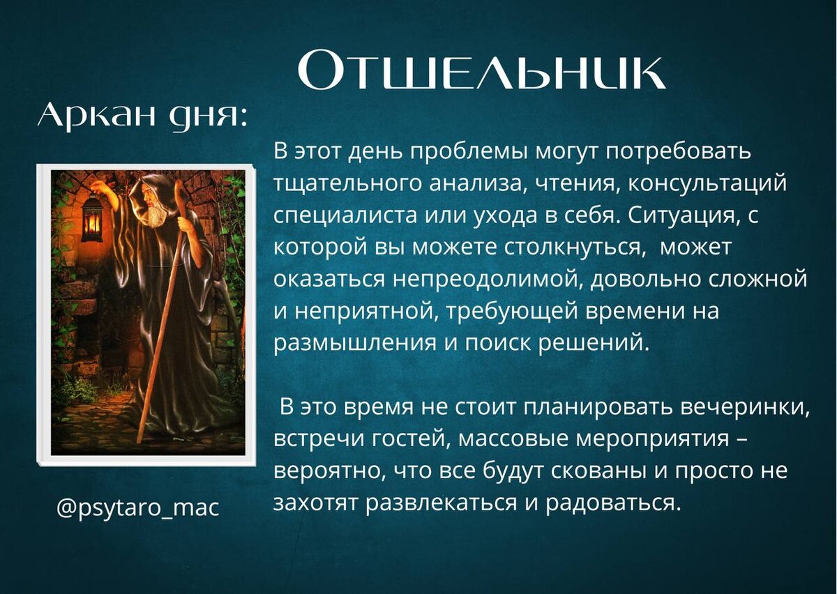 Я хотела сделать upgrade дизайна и информации. А также, была идея добавить к ней краткую информацию по лунным суткам. Но ввиду насыщенных жизненных событий, руки так и не дошли... Так что, пока возвращаю Аркан дня в том виде, в котором он был. Напомню, что Аркан дня - это не карта, вытащенная наугад из колоды,а расчет суммы календарной даты, сопоставленной со значением Старших Арканов Таро, что дает более конкретное описание текущей энергетики. А пока напишите в комментариях, нужно ли добавлять инфо по лунным суткам и, конечно же, поддержите рубрику реакциями. Так я понимаю, насколько она для вас актуальна! 💬 НОВЫЕ СМЫСЛЫ| Подписаться в Вк