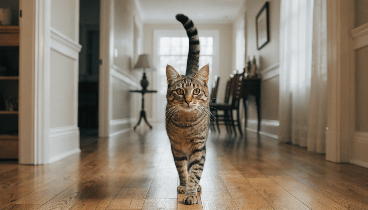 Вы входите домой — и кот идёт навстречу с хвостом, поднятым строго вертикально. Или выходите из комнаты, и он встречает вас так же. Хвост торчит вверх, иногда чуть подрагивает на кончике. Многие хозяева замечают это, умиляются — и идут дальше. А между тем это один из самых чётких и недвусмысленных сигналов в кошачьем языке тела. Кот говорит с вами. Конкретно и ясно. Просто не словами. Вертикально поднятый хвост у кошки — это сигнал приветствия и дружелюбия. В дикой природе котята поднимают хвост перед матерью, когда подходят к ней: это одновременно идентификация («я свой, не угроза») и запрос на контакт. Взрослые кошки сохраняют этот жест в общении с теми, кому доверяют, — и переносят его на людей. Когда кот поднимает хвост трубой при вашем появлении — он обращается с вами как с тем, кому рад. Не из вежливости, не по привычке. Это искренний поведенческий маркер положительной эмоции. Кошки не умеют изображать радость, которой нет, — их мимика и язык тела работают честно, без социальных