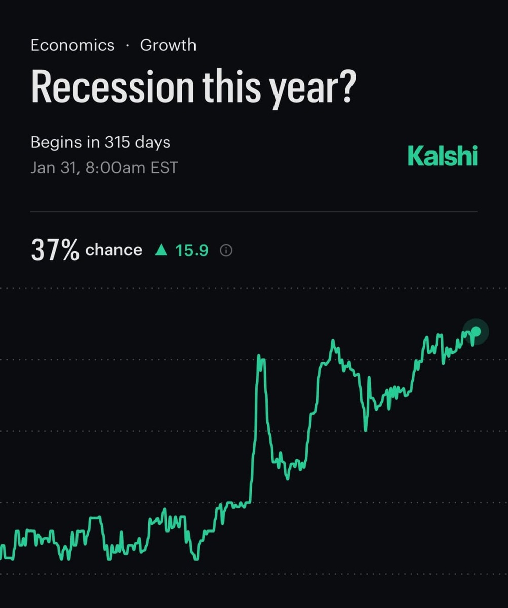 🔸По мнению пользователей платформы Kalshi, вероятность рецессии в США в этом году выросла до 37