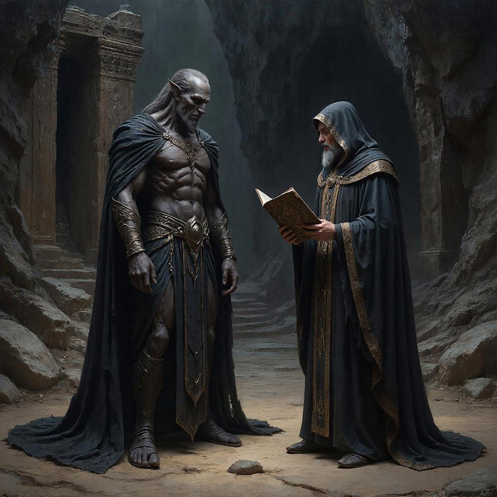 Действие происходит в зале с высокими сводами, где стены украшены мерцающими символами. В центре помещения — каменная плита, на которой время от времени проявляются и исчезают образы разных миров. Асмодей стоит у окна, глядя на рассвет; Жрец сидит в кресле напротив, сложив руки на коленях. В воздухе витает едва уловимый аромат благовоний.